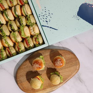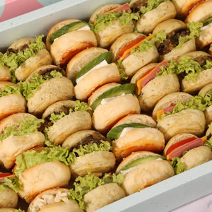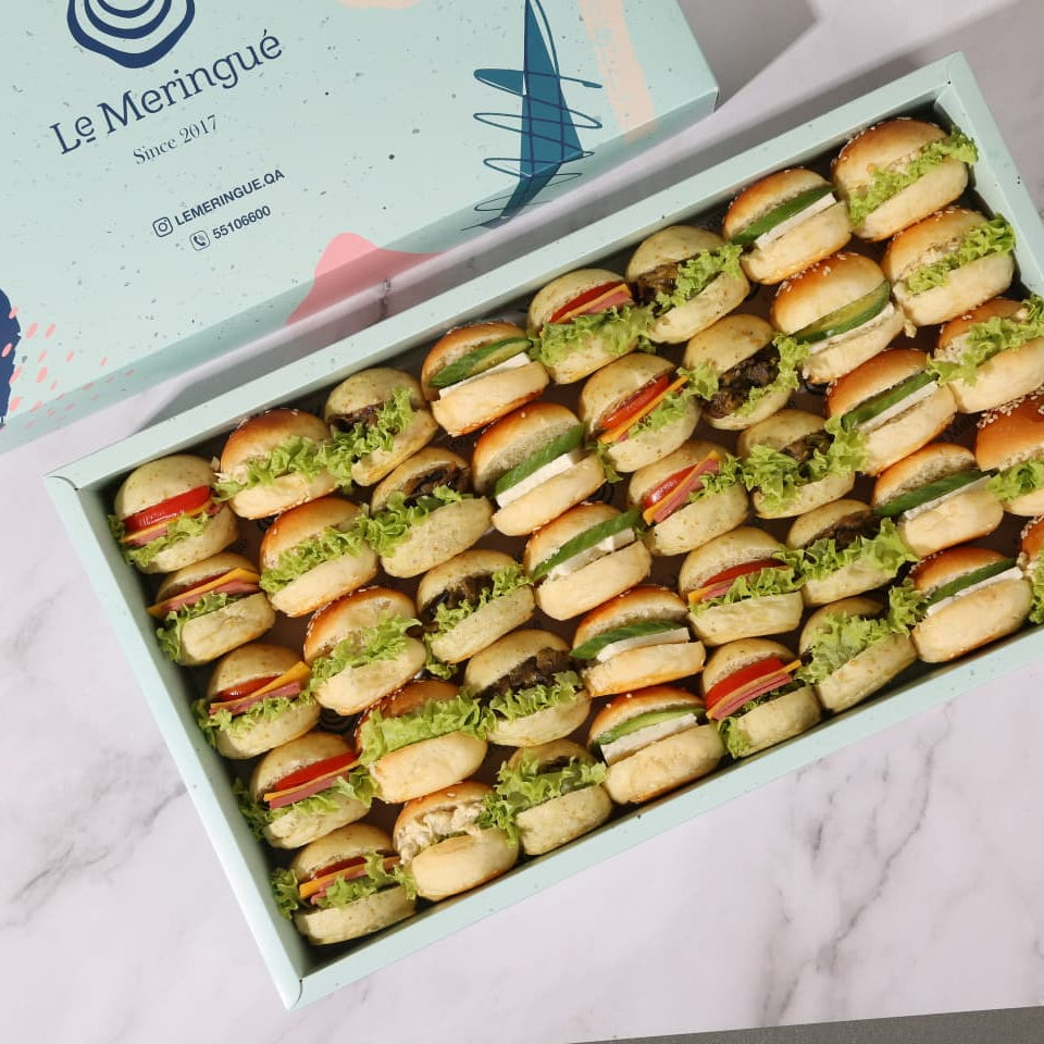 | Box contains 40 piece of mini sandwich: - Egg Salad - Egg Plant - Turkish Mortadella & Yellow Cheddar Cheese - Halloumi بوكس يحتوي على 40 حبة ميني ساندويش بمذاقات: - سلطة البيض - الباذنجان - مورتاديلا لحم البقر، جبن شيدر أصفر - حلوم |